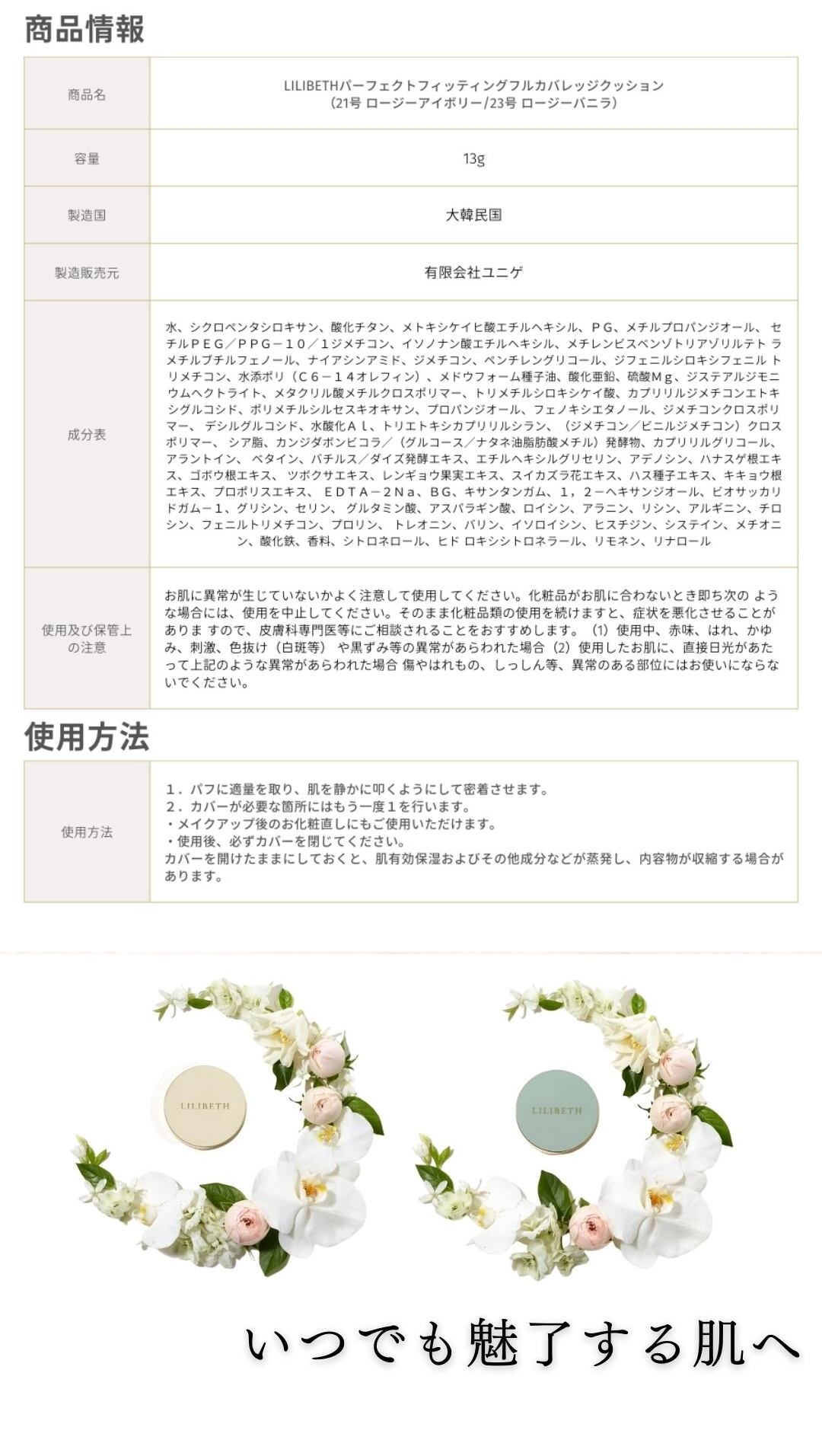 LILIBETH パーフェクトフィッティングフルカバレッジクッションファンデーション #21ロージーアイボリー #23ロージーバニラ