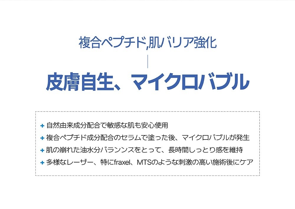 肌再生セラムで肌バリアの損傷部分を柔らかいバブルセラムによって十分に保湿し、細かい粒子で肌の奥深くに浸透して栄養を供給する超保湿肌再生セラムです。